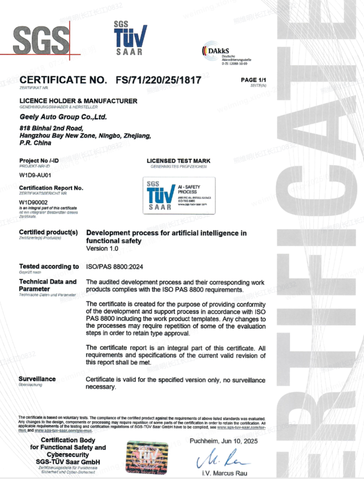 Ovu je akreditaciju dodijelilo njemačko akreditacijsko tijelo DAkkS, čime je potvrđena Geelyjeva napredna inženjerska stručnost u tri ključna međunarodna područja: funkcionalna sigurnost, očekivana funkcionalna sigurnost i sigurnost umjetne inteligencije.
